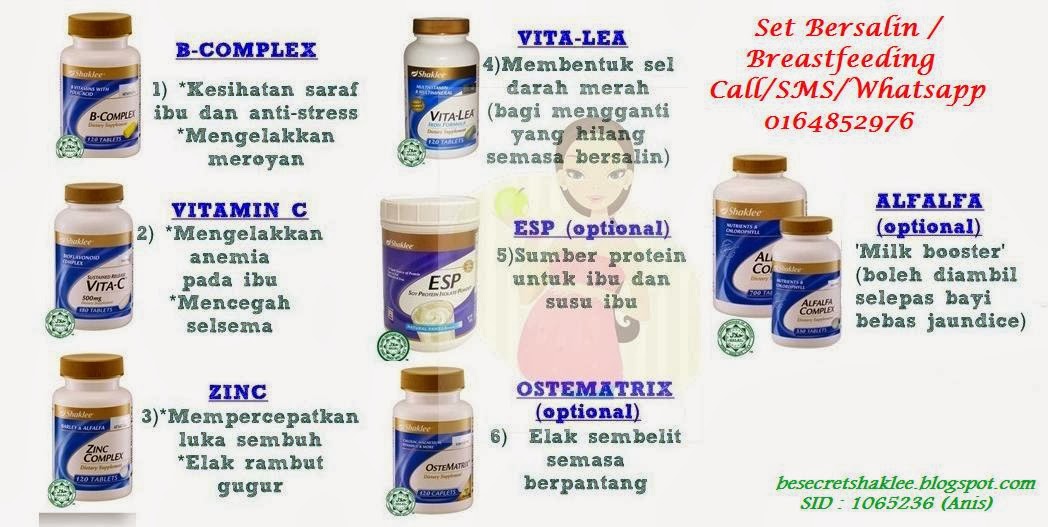 Haaa... Set besalin dan Breasfeeding ni khas utk bakal ibu yang nak besalin or ibu yang dah besalin, or yang tgh breasfeeding... Jom tgk SET Shaklee ni.. Amat sesuai utk membantu tahap kesihatan yg optimum dan as a "milk booster" utk ibu-ibu.. Pecayalah...dah ramai kawan-kawan saya order amat berpuas hati dan sentiasa repeat order... Ha..Apa lagi... order lah cepat ye.. Especially ESP..tgh promo bulan ni..sangat laris..asyik habis je stock kat rumah.. hehe... Selamat mencuba ya..
